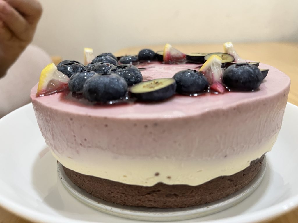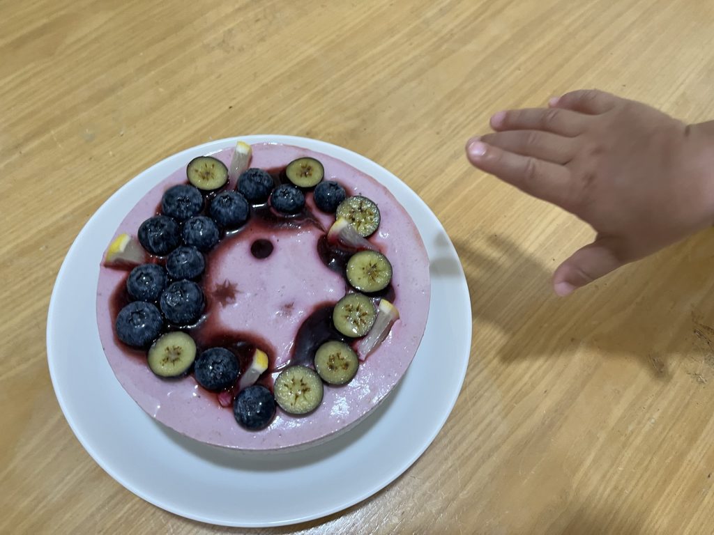 雖然在外面買一個蛋糕特別省事,選擇又多,但卻很想弄一個生日蛋糕給我的母親。最近家裏買了很多好吃的藍莓,而且它有花青素為食物帶來天然的紫色,是其中一種很適合送給媽媽的顏色,讓人感覺溫婉而堅韌。老規矩,必須等小寶睡了才開動,於是晚上9時動工,可能是我高估了自己的能力吧,過程中遇到了很多沮喪的事情令我要砍掉重來,包括餅底弄破了許多次、魚膠片用了熱水浸泡令它融化得非常徹底、裝飾參考了亦想了良久等等,結果弄到差不多1點才睡… 最後也不負所望、大功告成!不論外觀和味道媽媽都非常喜歡!大滿足!